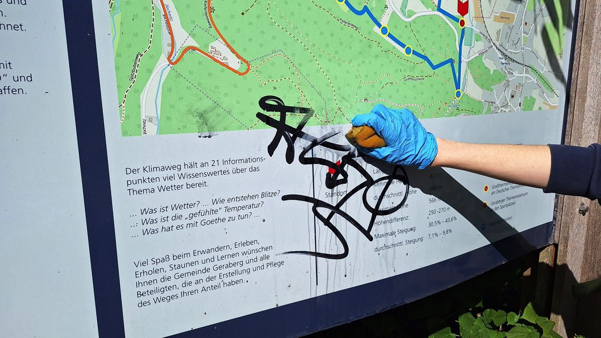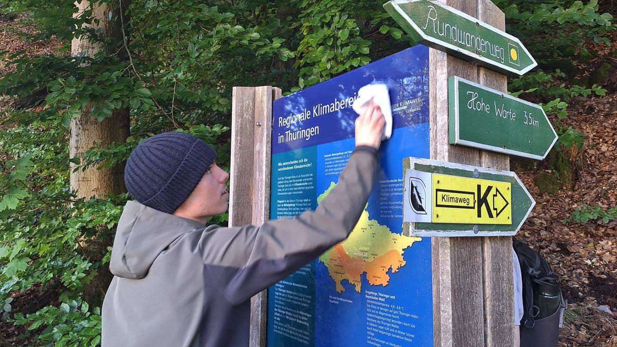 jüngst traf sich eine engagierte Schülergruppe unseres Schullandheim Geraberg, um auf dem Thüringer Klimaweg tatkräftig mit anzupacken. Der Anlass: Viele der Informationstafeln waren veraltet – verschmutzt, moosbewachsen oder überwuchert von Sträuchern und Hecken – und damit nur schwer oder gar nicht mehr lesbar. Gemeinsam säuberten die Schülerinnen und Schüler die Tafeln, schnitten Pflanzen zurück und sorgten dafür, dass wieder alle Inhalte gut erkennbar sind. So konnten sie ermöglichen, dass Wanderer die Informationen wieder klar wahrnehmen — und das aus eigenem Engagement und Einsatz für ihre Heimat.