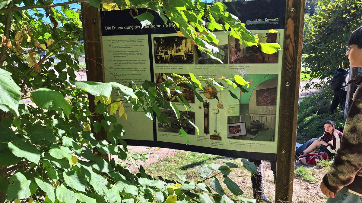 Zwei Großthermometer stehen entlang des Wegs — darunter der beeindruckende Geraberger Thermometerturm, das weltgrößte Flüssigkeitausdehnungsthermometer, das auf dem Gelände des ehemaligen größten Thermometerwerks Europas errichtet wurde.