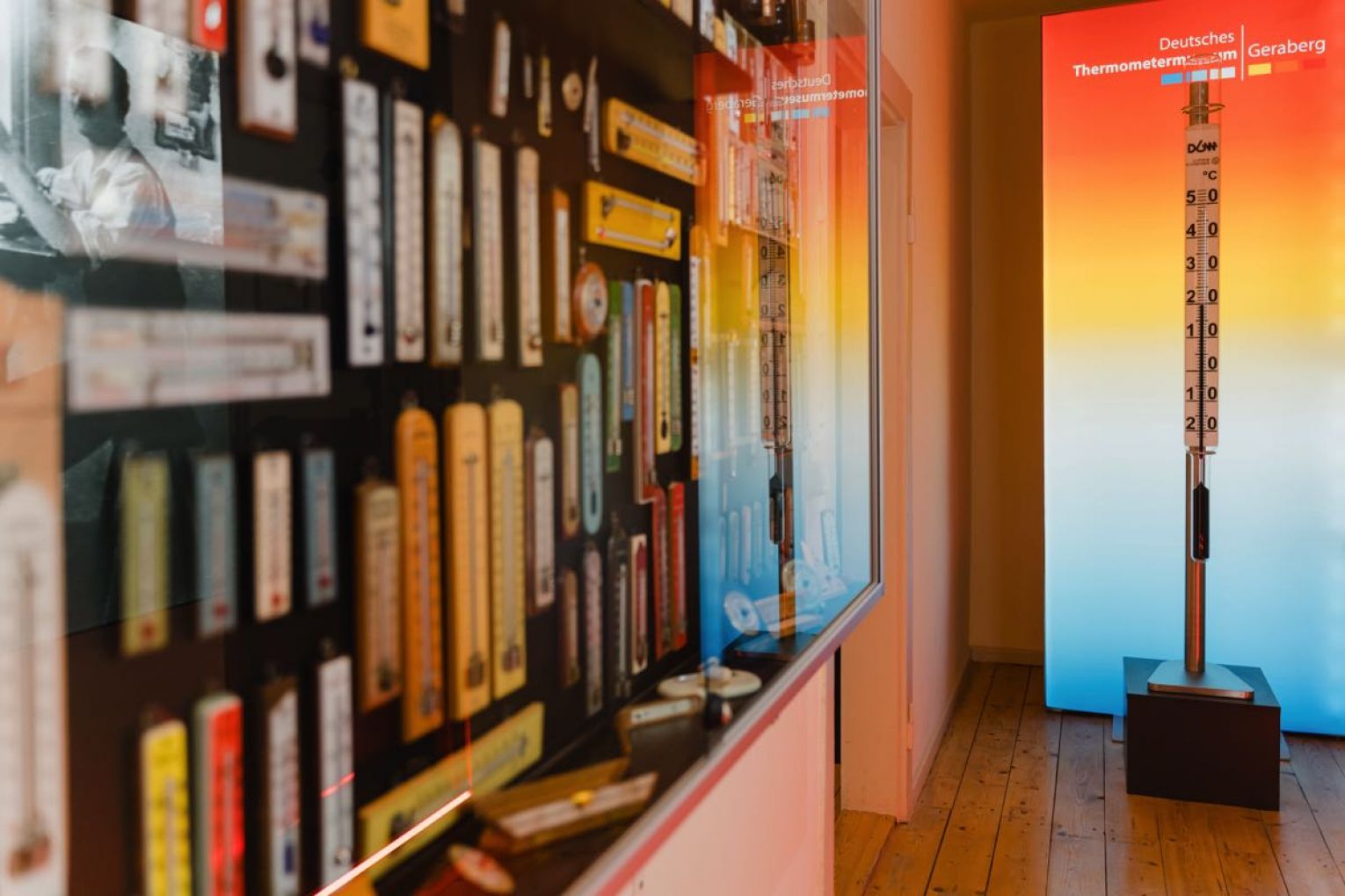 Der erste Teil des Thermometermuseums zeigt umfangreich die Entwicklungsgeschichte des Flüssigkeitsglasthermometers. Anhand von Thermometern und wertvollen Unterlagen, die älter als 100 Jahre sind, kann man nachvollziehen mit welcher Präzision schon zur damaligen Zeit die sogenannten Thermometermacher gearbeitet haben. Thermometer der verschiedensten Formen, Größen und Arten können bestaunt werden. Dabei kommen die Anwendungsgebiete nicht zu kurz, auch hier ist der Besucher gefragt und kann ausprobieren. Das Beste jedoch ist, wie ein Thermometer hergestellt wird, kann man durch die Vorführung eines Thermometerbläsers oder durch einen Videofilm erfahren.